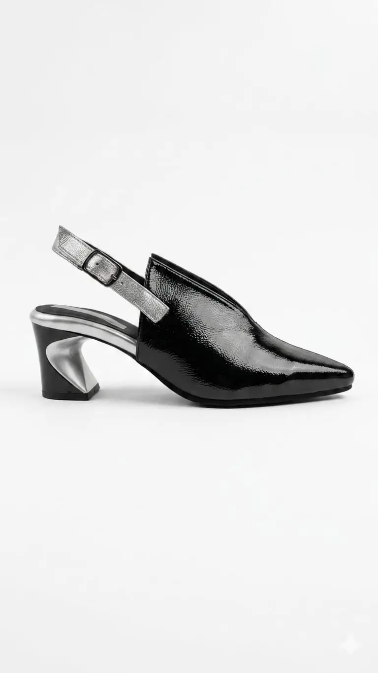 הכירי את הנעל שתהפוך כל לוק להצגה: שילוב מדויק בין לכה שחורה יוקרתית לעקב כסוף בעיצוב גיאומטרי עוצר נשימה. 🖤
