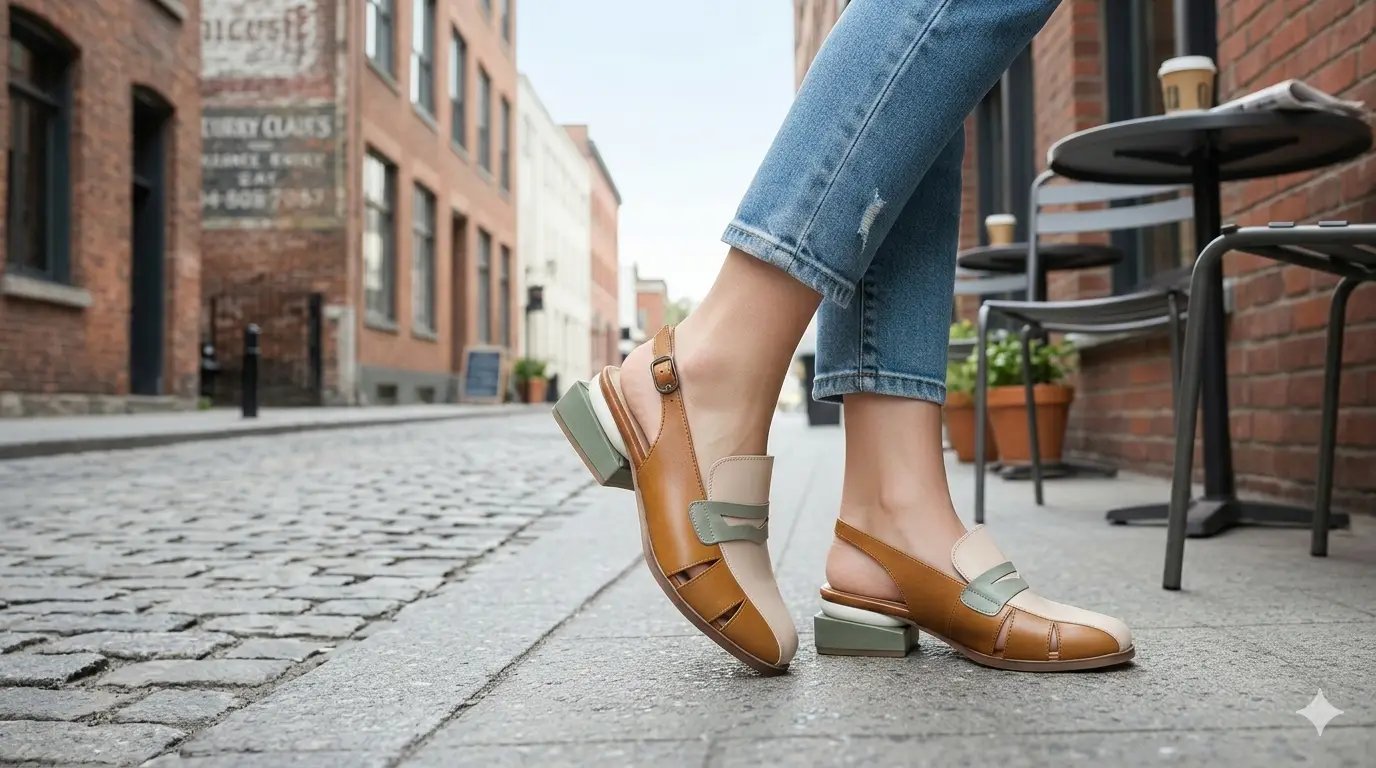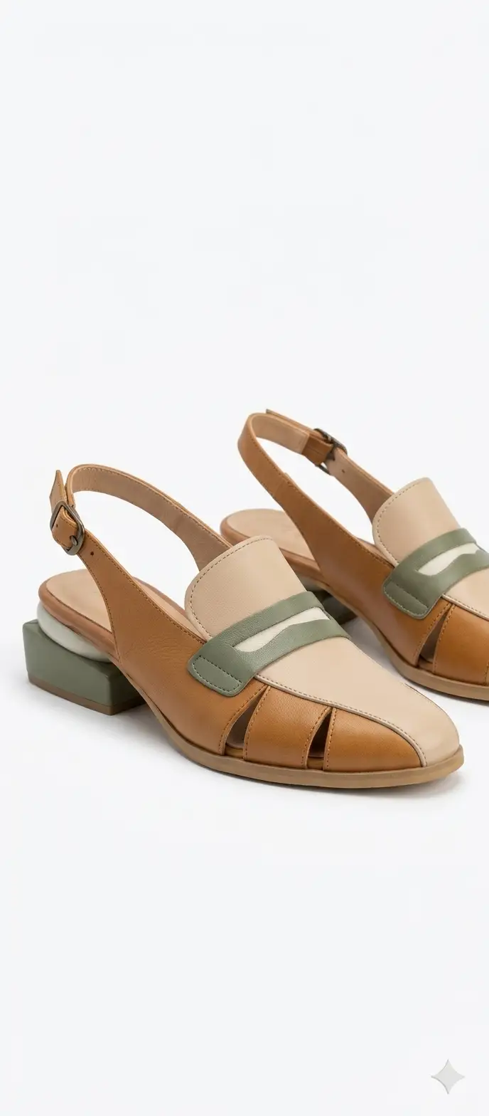 העיצוב משלב גווני קרם, חום וירוק פיסטוק , עם חיתוכים אלגנטיים ורצועה דקורטיבית שמעניקה טאץ' ייחודי. העקב הגיאומטרי הנמוך משלים את המראה ומאפשר לך ליהנות מנוחות לאורך כל היום בלי לוותר על שיק.