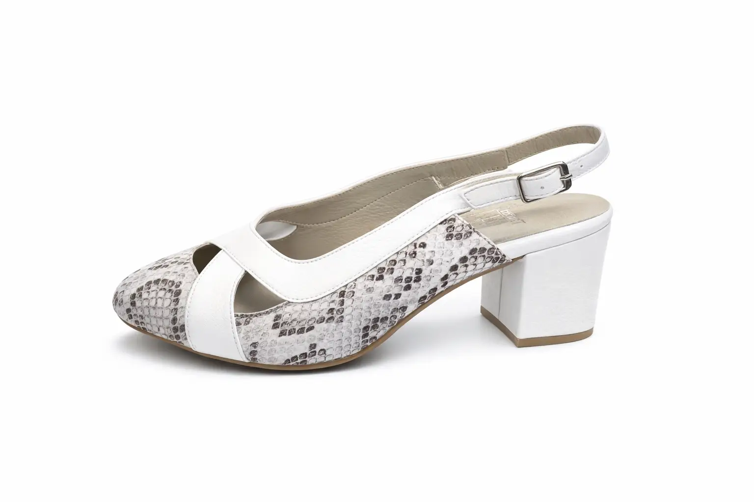 הנעל בתמונה היא סנדל אלגנטי עם עקב נמוך ומרובע בצבע לבן. היא כוללת שילוב מעניין של חומרים: דוגמת עור נחש אפרפר-שחור על החלק העיקרי של הסנדל, עם רצועות לבנות חלקות המצטלבות מעל הבהונות ויוצרות פתחים. לרצועת העקב יש אבזם מתכת כסוף קטן לכוונון והתאמה נוחה. החלק הפנימי של הסנדל מרופד בעור בהיר, והסוליה בצבע קרם בהיר. הסנדל נראה נוח ומעודן, מתאים לאירועים שונים או ללבוש יומיומי אלגנטי.