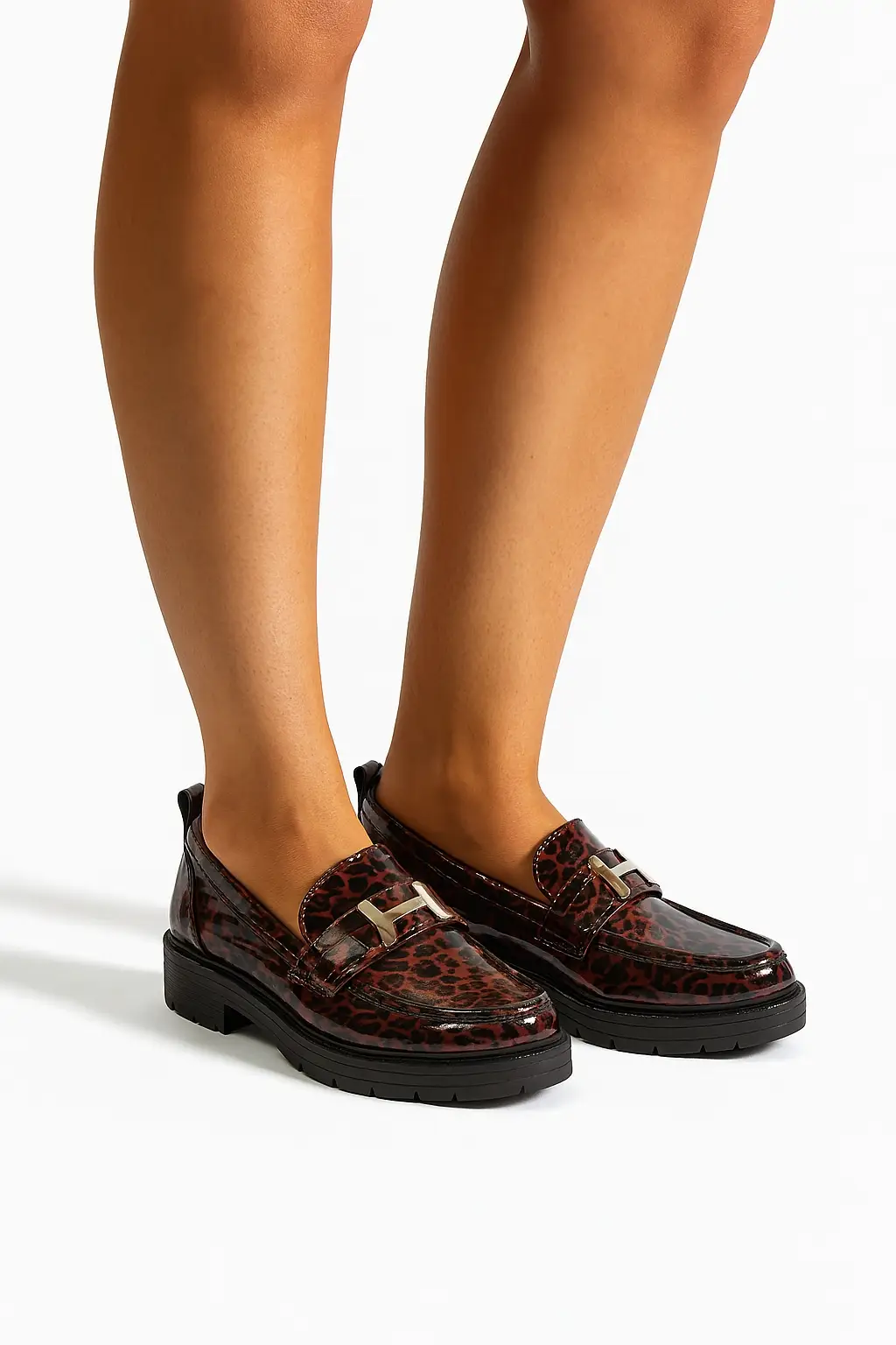 עם גימור לק מבריק, הדפס מנומר בגווני בורדו ושחור, וסוגר מתכת יוקרתי שמוסיף טאץ' של עוצמה — זו לא סתם נעל, זו הצהרה.