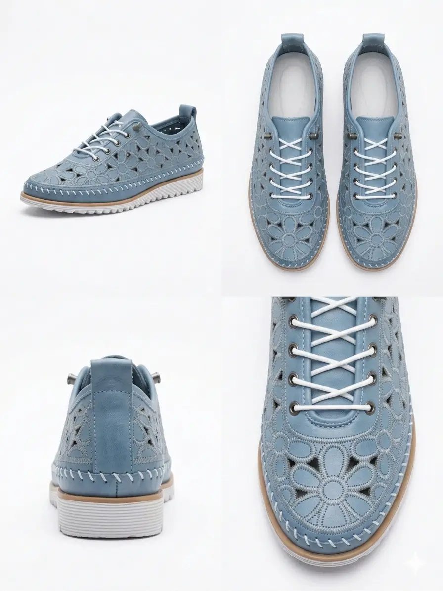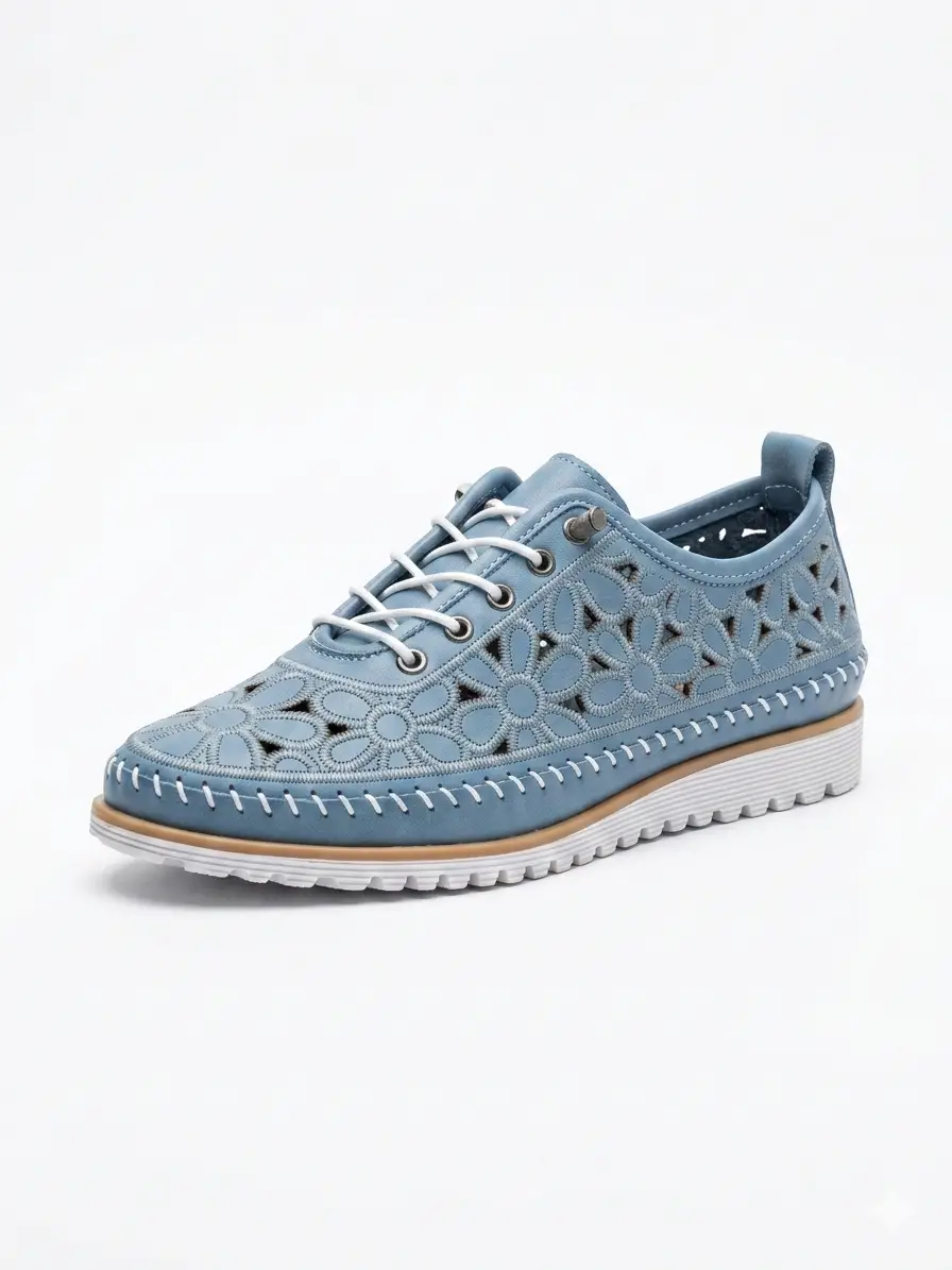 עיצוב: גפה כחולה עם חיתוכי לייזר ורקמת פרחים לאוורור מקסימלי.