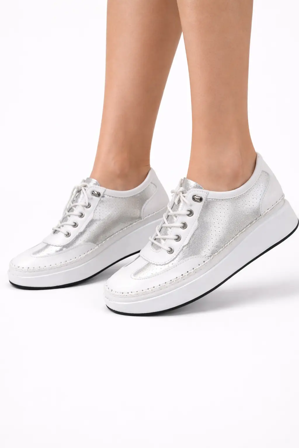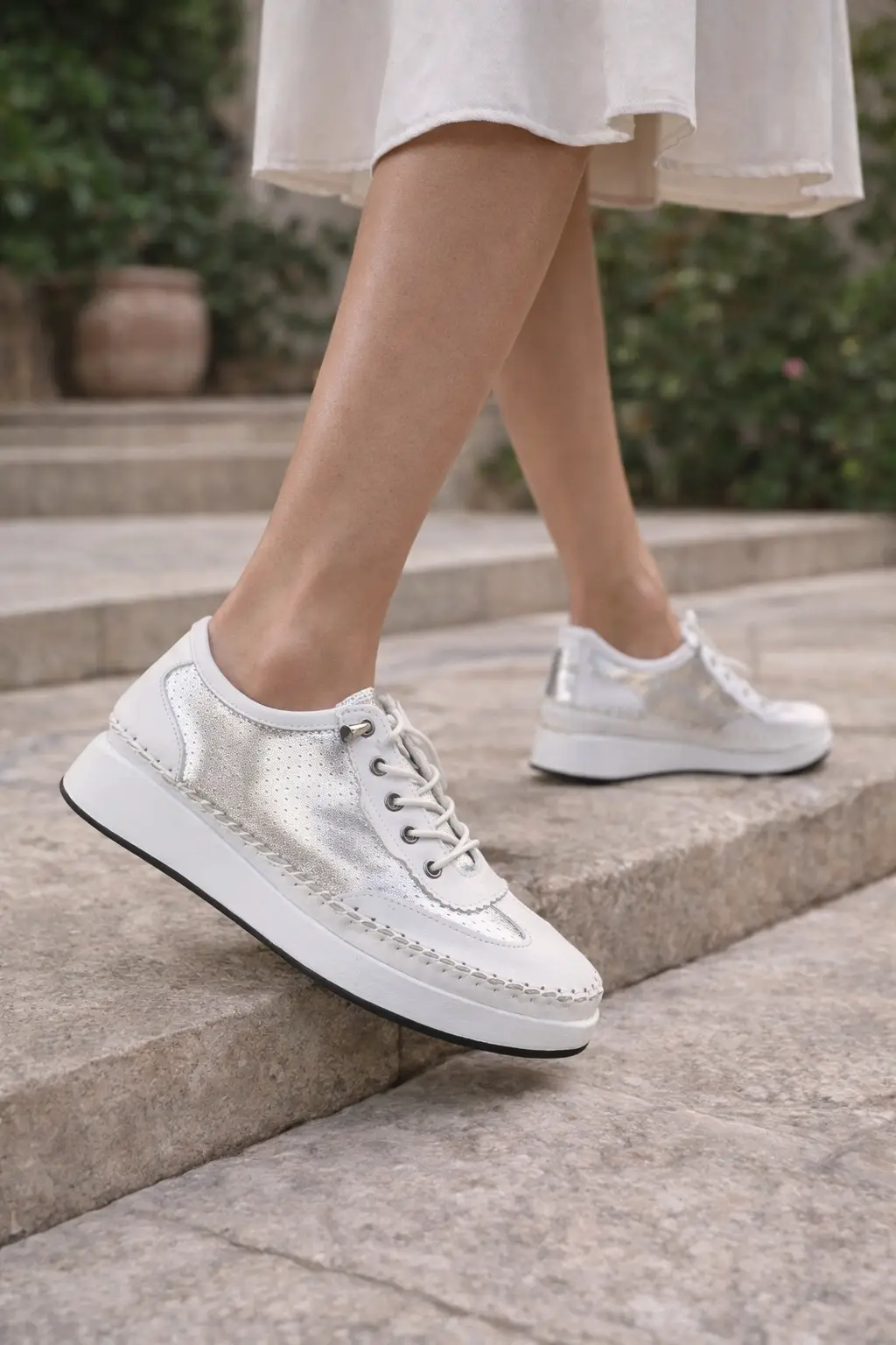 הסניקרס החדשות שלנו כאן כדי להוכיח שאפשר ליהנות מכל העולמות: נוחות מקסימלית של סוליית פלטפורמה לצד שיק יוקרתי בנגיעות כסופות.